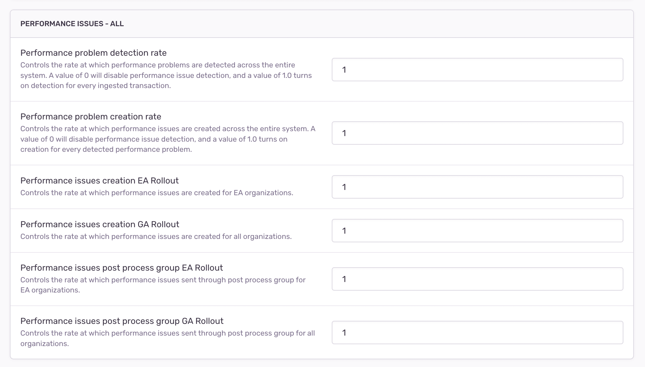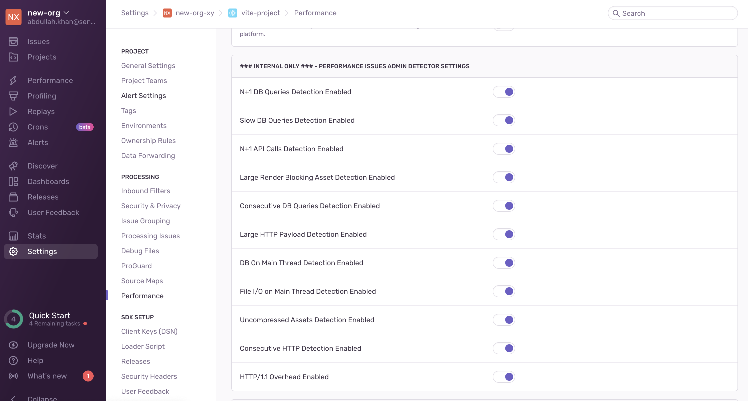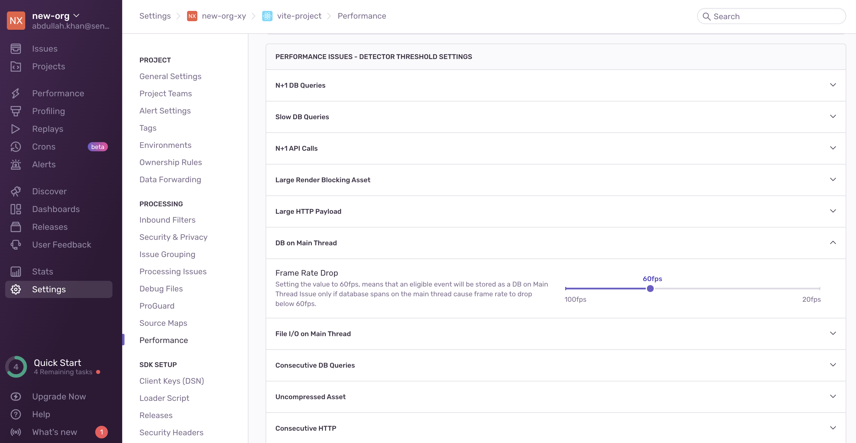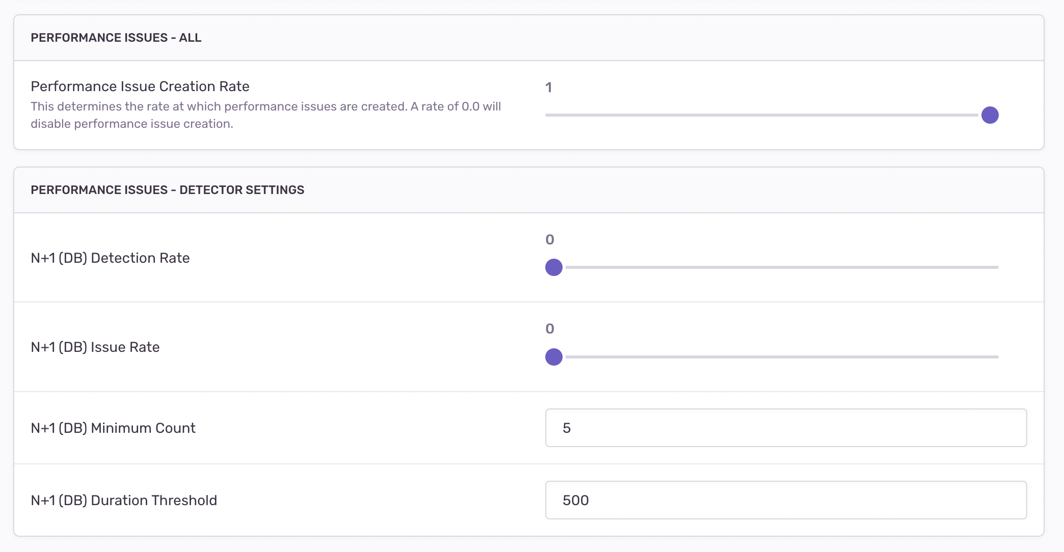 Once the detector has been tested and deployed, you can add the corresponding issue to the list of detector threshold settings in Project Settings > Performance: